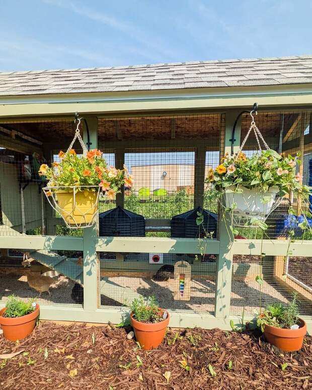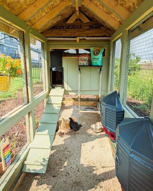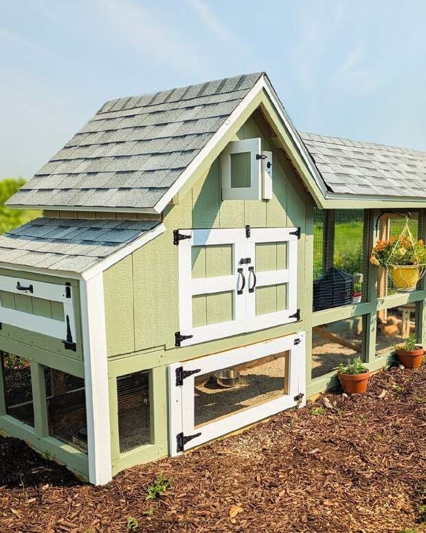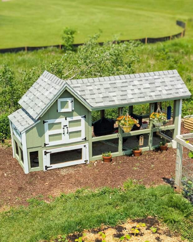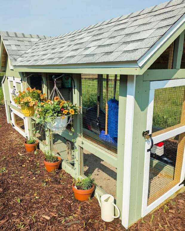 Спрятанный в цветущем саду и окрашенный в самый красивый оттенок зеленого шалфея, этот курятник является домом для 4 кур 🐓 🌿